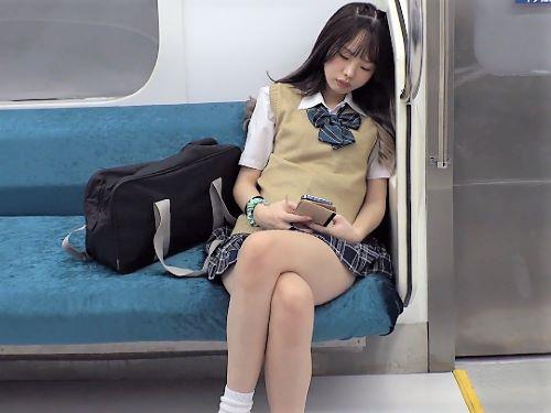 【制服女子校生】最終電車でおじさん相手にパンチラ誘惑し痴女ってくるスレンダー美少女がミニスカ捲りパンツの中に手をいれオナニー